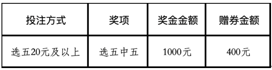 1.活動期間,凡在我省福彩銷售網(wǎng)點購買快樂8游戲選五玩法彩票,且單票金額超過20元(含)的,對選五中五獎級每注贈送400元彩票兌換券,倍中倍送。