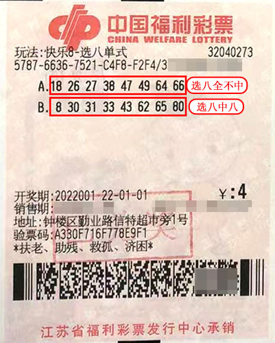 新晉彩友吳先生平日里偶爾購彩。近日,他在鐘樓區(qū)勤業(yè)路32040273福彩投注站投注時(shí),在快樂8第2022001期花4元隨機(jī)投注了2組選八單式號(hào)碼,結(jié)果喜中1注“選八中八”和1注“選八全不中”,共計(jì)中得獎(jiǎng)金5萬余元。