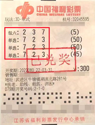據(jù)了解,中獎?wù)邨钕壬ɑ┦歉2实睦吓笥选.?dāng)期他在武進(jìn)區(qū)牛塘鎮(zhèn)32045595福彩投注站休閑娛樂,對號碼“723”進(jìn)行了145倍單選投注和5倍組六投注。根據(jù)活動規(guī)則,派獎期間,3D單選原獎金1040元加獎至1420元,組六原獎金173元加獎至230元,因此,楊先生此次共計(jì)攬獲獎金20.7萬余元,其中含派獎獎金5.5萬余元。