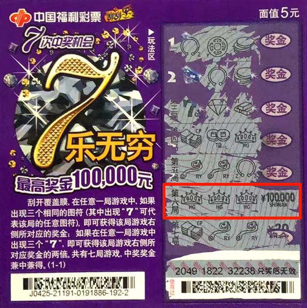據了解,中獎者劉先生(化名)是一位年輕彩友,偶爾購彩消遣,主力購買刮刮樂彩票。近日他照常在站點休閑時,在一張“7樂無窮”彩票的第六局游戲中,刮出3個相同的皇冠圖符,根據游戲規(guī)則中得對應獎金10萬元。