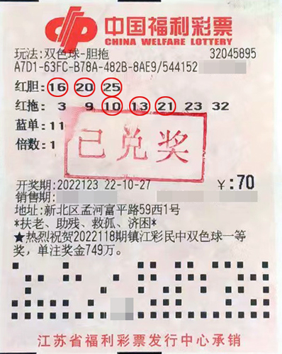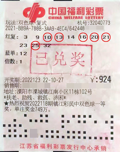 還有一張中獎彩票為紅球復式票,出自溧陽市溧城鎮(zhèn)32040773福彩投注站。開獎后經(jīng)核對,這張彩票中得1注二等獎、30注四等獎和150注五等獎,共計中得獎金4.7萬余元。
