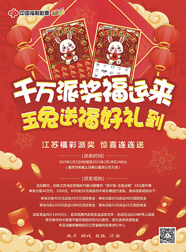 新票亮相,好禮相送!江蘇福彩為回饋廣大彩民朋友對即開票的厚愛和支持,在推出“癸卯兔-玉兔送福”新票的同時,還開展“獎上獎”活動,讓你驚喜連連好運不斷。即自2023年1月5日0時起至2023年2月28日24時止,對“癸卯兔-玉兔送福”10元即開票單張兌取40萬元、1000元、60元和50元獎級的中獎彩票分別派獎40萬元、1000元、40元、25元。本次派獎獎金共計1000萬元,若派獎獎期內派獎獎金派發(fā)完畢,則派完當日24時停止派送。