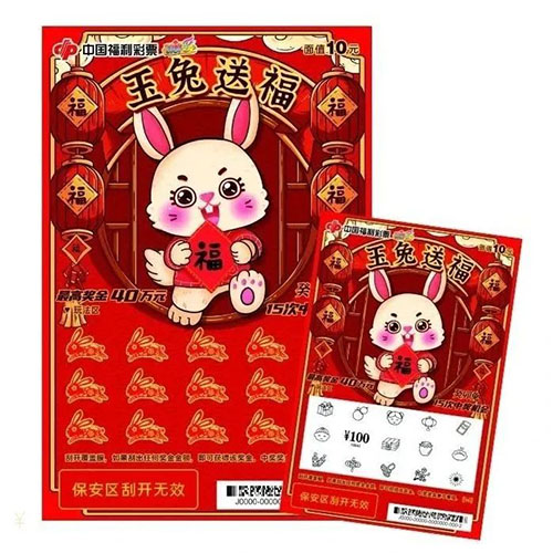 本次福彩新春主題系列即開票推出10元面值“癸卯兔-玉兔送福”,最高獎40萬元。該票面整體充滿傳統(tǒng)節(jié)慶韻味,活潑喜慶的卡通兔手拿福印,表達了對新一年美好未來的祝愿。票面設計上搭配燈籠、鞭炮等中國傳統(tǒng)新年元素彰顯情感化、擬人化主題。標題《玉兔送?!焚N合主題,節(jié)慶感更加突出,煥發(fā)兔年傳統(tǒng)生肖產品新生活力。該票玩法簡單,采用“找獎金符號”的游戲玩法,即刮開覆蓋膜,如果刮出任何獎金金額,即可獲得該獎金,中獎獎金兼中兼得。