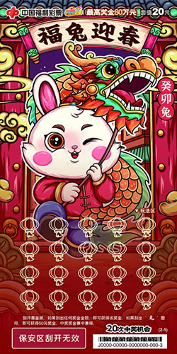 “福兔迎春”面值20元,全套2張,采用國潮手繪的明信片設(shè)計風格,將福兔舞龍舞獅的生動畫面呈現(xiàn)于票面之上,與春節(jié)的喜慶祥和氛圍相契合。刮開區(qū)的燈籠獎符,細膩而動感,與主題呼應(yīng)。該游戲最高獎金80萬元,中獎獎金兼中兼得。