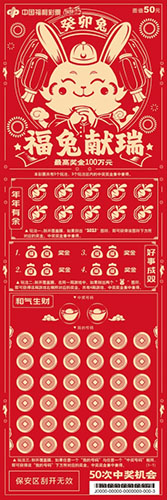 “福兔獻瑞”面值50元,是一款高面值的生肖主題票,采用新版畫設(shè)計思路,票面將金色兔作為主形象,紅金兩色搭配符合喜慶的春節(jié)氣氛。“年年有余”“好事成雙”“和氣生財”三個玩法區(qū),分別對應(yīng)“即中”“兩同圖”“對數(shù)字”玩法,并將胡蘿卜、錢袋、金幣等元素作為相應(yīng)玩法區(qū)獎符,增添節(jié)日的喜慶祥和氣氛。三個玩法區(qū)共50次中獎機會,獎金兼中兼得,最高獎金100萬元。