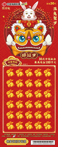 “玉兔賀歲”面值30元,全套6張,以除夕到初五的過年民俗為設(shè)計思路,巧妙地用擬人化手法,演繹了辭舊歲、拜大年、回娘家、宅家日、迎灶君、迎財神6個主題,講述了春節(jié)文化故事,增加了生肖票的“年味”。該游戲最高獎金100萬元,30次中獎機會,獎金兼中兼得。