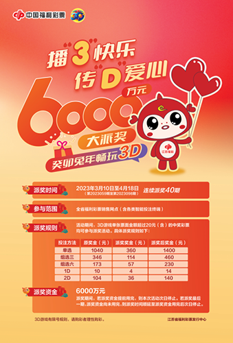 為回饋廣大購彩者對福彩3D游戲的喜愛與支持,江蘇省福利彩票發(fā)行中心決定開展2023年3D游戲6000萬元派獎活動?,F(xiàn)就有關事項公告如下: