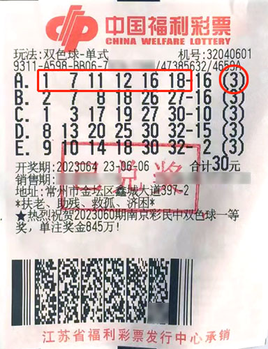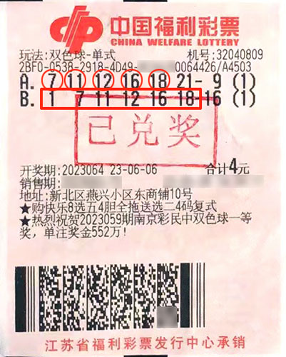 6月6日晚,雙色球第2023064期開出“紅球1、7、11、12、16、18,藍(lán)球4”。當(dāng)期雙色球“老粉”秦先生(化名)在新北區(qū)燕興小區(qū)32040809福彩投注站,花4元手選了2組單式號碼。沒想到2組號碼都有收獲,分別中得1注二等獎和1注四等獎,共計中得獎金8.4萬余元。