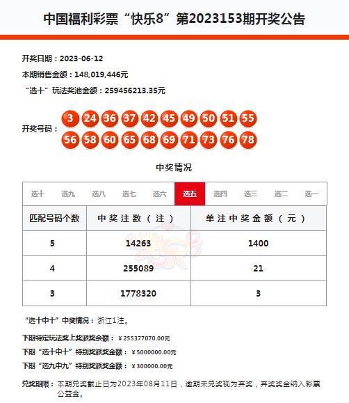 6月12日晚,快樂8游戲第2023153期開獎。當期出自新北區(qū)春江鎮(zhèn)32040872福彩投注站的一張選五4膽全拖票,以“37、45、55、56”4個號碼為膽碼、其余76個號碼為拖碼“組隊迎戰(zhàn)”,并進行了10倍投注。開獎后經核對,該張彩票共計中得160注“選五中五”和600注“選五中四”。根據快樂8“特定玩法獎上獎”的派獎規(guī)則,“選五中五”單注獎金從1000元提高至1400元,因此該張彩票共計中得獎金23.66萬元,其中包括派獎獎金6.4萬元。