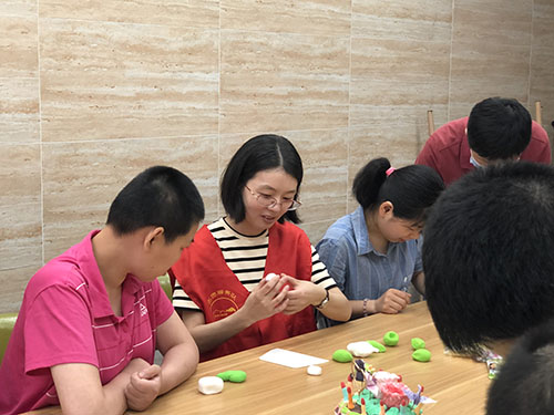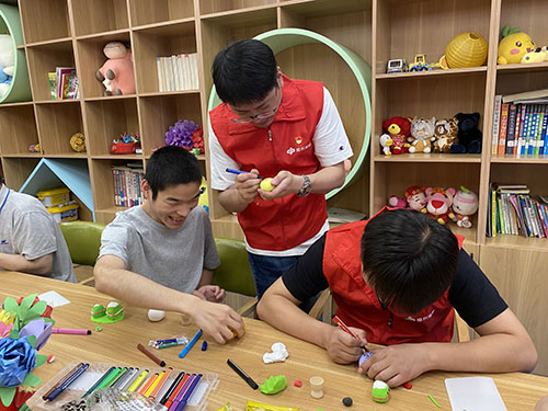 隨著老師的講解,志愿者和孩子們一起成為“學(xué)生”,開啟捏制彩泥粽子的環(huán)節(jié)。有的孩子心靈手巧,上手極快;有的孩子創(chuàng)意十足,在老師的講解外增添了額外童真;有的孩子開朗活潑,不時向志愿者求助——“這個我不會捏,你幫我”、“這個你做得好,再做一個”……繪制蛋殼時,一個手勢、一句夸贊,讓孩子們都露出了愉悅的笑容。在這些創(chuàng)意手工互動中,志愿者們也充分感受到了中國傳統(tǒng)習(xí)俗的魅力,進(jìn)一步豐富了精神文化生活。