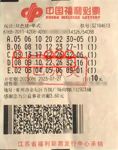 據(jù)了解,該獎出自金壇區(qū)吾悅廣場32184613福彩銷售點(diǎn)。中獎市民小張(化名)是一位90后,接觸彩票不久,偶爾購彩休閑。當(dāng)期她在銷售點(diǎn)花10元錢自選投注了五組單式號碼,開獎后與開獎號碼“紅球8、9、10、22、26、32,藍(lán)球12”核對,發(fā)現(xiàn)其中一組號碼紅球全中,中得二等獎獎金12.5萬余元,另一組號碼擊中4個紅球,中得五等獎獎金10元。