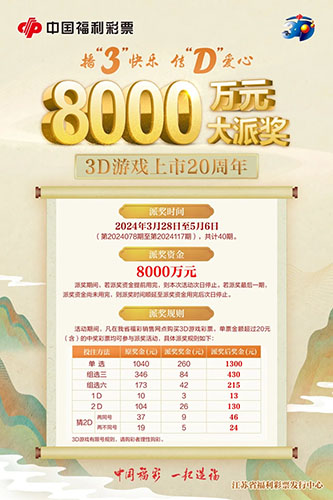 為回饋廣大購(gòu)彩者對(duì)福彩3D游戲的喜愛(ài)與支持,江蘇省福利彩票發(fā)行中心決定開展2024年3D游戲8000萬(wàn)元派獎(jiǎng)活動(dòng)。現(xiàn)就有關(guān)事項(xiàng)公告如下: