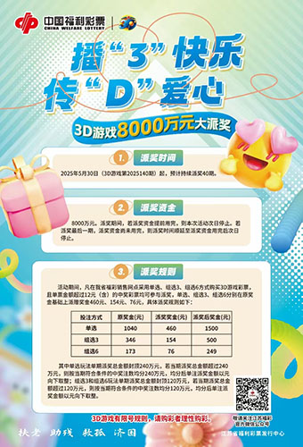 2025年5月30日(3D游戲第2025140期)起,預(yù)計持續(xù)派獎40期。派獎期間,若派獎資金提前用完,則本次活動次日停止。若派獎最后一期,派獎資金尚未用完,則派獎時間順延至派獎資金用完后次日停止。