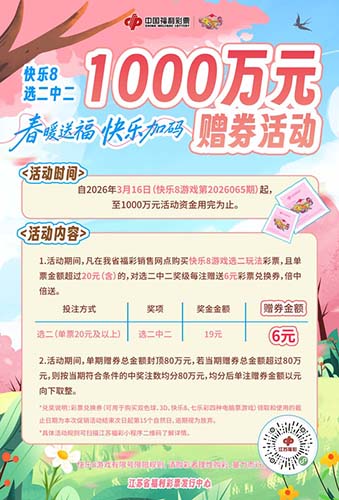 為感恩廣大購彩者對快樂8游戲的喜愛與支持,江蘇福彩傾情推出“春暖送福,快樂加碼”1000萬元贈券活動。