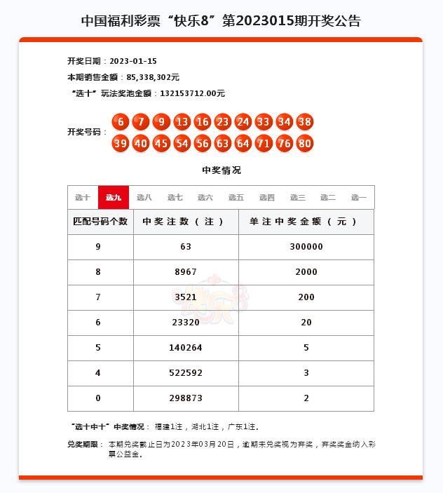巧的是,兩張中獎票均是投注金額為20元的選九復(fù)式票;更妙的是,它們都中得了1注“選九中九”和9注“選九中八”。由于快樂8派獎期間“選九中九”單注派獎30萬元,因此,兩位幸運(yùn)市民本次齊齊領(lǐng)回了61.8萬元的獎金。
