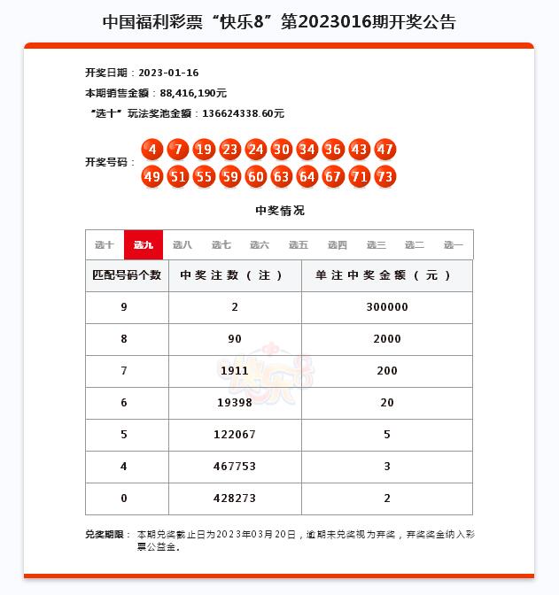 快樂8游戲3600萬元迎新大派獎活動開展期間,針對選一(中一)、選二(中二)、選四(中四)、選五(中五)、選六(中六)和選九(中九)六個獎級進(jìn)行派獎,返獎率最高可達(dá)75%。