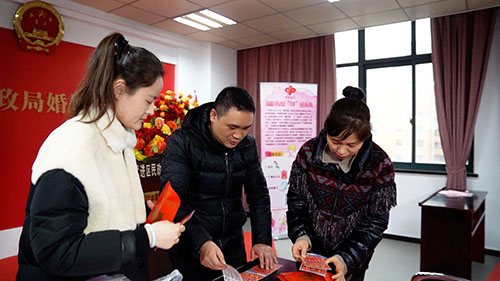 214日情人節(jié)當天,武進區(qū)福彩中心在區(qū)婚姻登記處開展福彩有愛 證未來公益活動,通過一枝花、一個福彩紅包、一個小視頻、一張祝福卡、一對愛心手印五個一活動為新人們送上溫馨祝福。