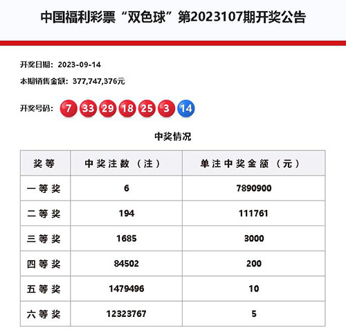 9月14日晚,雙色球第2023107期開獎,當期開出紅球3、7、18、25、29、33,藍球14。其中,二等獎開出194注,單注獎金11.1萬余元。我市一位幸運市民喜中1注二等獎。