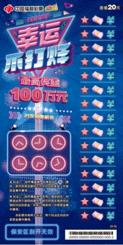 刮刮樂游戲“幸運不打烊”單張面值20元,共21次中獎機會,最高獎金100萬元。以游樂場霓虹燈宣傳牌為設(shè)計靈感,以炫藍色為主背景,酷炫、閃耀、夢幻的光芒堪稱全場最耀眼的存在。璀璨繁華的霓虹燈牌點亮了幸運、解鎖了驚喜,為您帶來一場絕美的色彩盛宴。刮開區(qū)選用粉色星星、財富類元素,寓意幸運滿滿、財運連連。