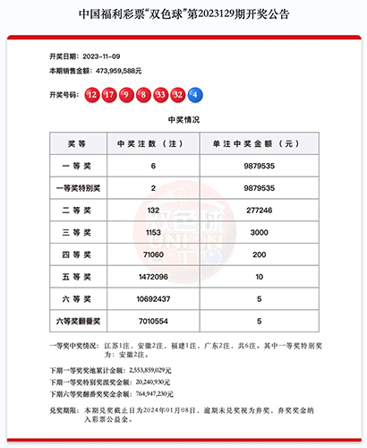11月9日晚,雙色球游戲第2023129期開獎(jiǎng),開出紅球號(hào)碼8、9、12、17、32、33,藍(lán)球號(hào)碼4。當(dāng)期雙色球一等獎(jiǎng)中出6注,單注獎(jiǎng)金987萬多元,全省中出的唯一一注一等獎(jiǎng)花落常州。