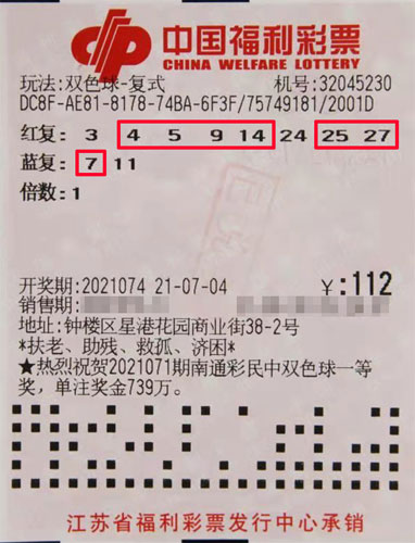 我省唯一的1注一等獎(jiǎng)被常州彩民摘得。幸運(yùn)站點(diǎn)是常州市鐘樓區(qū)星港花園商業(yè)街28-2號(hào)、編號(hào)為32045230的福彩投注站,出票時(shí)間是2021年6月30日9時(shí)26分07秒。該票采用復(fù)式投注的方式,選擇了8個(gè)紅球、2個(gè)藍(lán)球,花費(fèi)112元,投注了56注號(hào)碼,喜中1注一等獎(jiǎng)、1注二等獎(jiǎng)、12注三等獎(jiǎng)、27注四等獎(jiǎng)、15注五等獎(jiǎng),收獲獎(jiǎng)金595多萬元。由于恰逢江蘇福彩“雙色球感恩回饋月”最后一期,派送獎(jiǎng)金150萬元,該彩民共計(jì)攬得獎(jiǎng)金745萬多元。