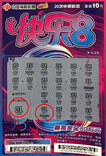 據(jù)了解,中獎?wù)邉⑾壬ɑ┦歉2市虏视选4汗?jié)前,他在購物時用零錢隨意買了幾張刮刮樂彩票,結(jié)果刮開一張“快樂8”票面后發(fā)現(xiàn),其中一個“我的號碼01”正與“中獎號碼01”相同,按照游戲規(guī)則,中得對應(yīng)獎金8萬元。劉先生說,自己購彩就是娛樂一下,沒想到一下子就中了挺大一個獎,太驚喜了!