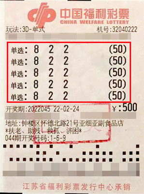 據(jù)了解,中獎?wù)咤X先生(化名)是福彩的老朋友,對3D游戲喜愛有加。當(dāng)期他在鐘樓區(qū)懷德北路32040222福彩投注站購彩消遣,對號碼“822”突發(fā)靈感,就一鼓作氣進(jìn)行了2000倍單選投注,沒想到果真如愿擊中了開獎號碼,擒獲獎金208萬元。
