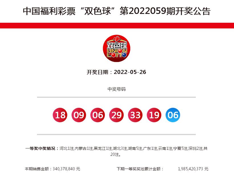 5月26日晚,雙色球第2022059期開出紅球06、09、18、19、29、33,藍(lán)球06。當(dāng)期全國開出二等獎(jiǎng)216注,單注獎(jiǎng)金8.26余萬元。我市一位幸運(yùn)市民豪攬50注二等獎(jiǎng),喜中獎(jiǎng)金413萬余元。