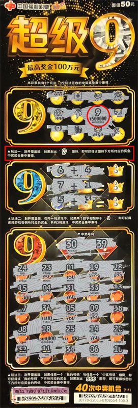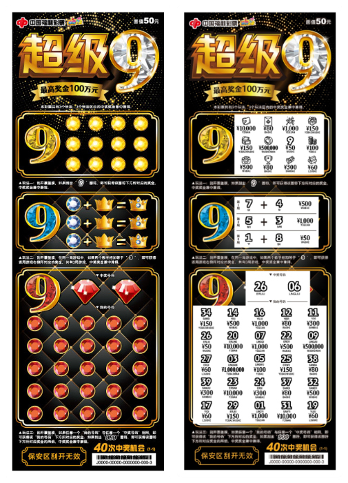 “超級(jí)9”刮刮樂票面設(shè)計(jì)炫酷神秘、富有質(zhì)感。該票面值50元,獎(jiǎng)等共設(shè)置11級(jí),有40次中獎(jiǎng)機(jī)會(huì),最高可中100萬元。共有3個(gè)玩法,3個(gè)玩法區(qū)內(nèi)的中獎(jiǎng)獎(jiǎng)金兼中兼得。玩法一:刮開覆蓋膜,如果刮出“9”圖符,即可獲得該圖符下方所對(duì)應(yīng)的獎(jiǎng)金;玩法二:刮開覆蓋膜,在同一局游戲中,如果兩個(gè)數(shù)字相加等于“9”,即可獲得該局游戲右側(cè)所對(duì)應(yīng)的獎(jiǎng)金;玩法三:刮開覆蓋膜,如果任意一個(gè)“我的號(hào)碼”與任意一個(gè)“中獎(jiǎng)號(hào)碼”相同,即可獲得該“我的號(hào)碼”下方所對(duì)應(yīng)的獎(jiǎng)金;如果刮出“999”圖符,即可獲得該圖符下方所對(duì)應(yīng)獎(jiǎng)金的兩倍。