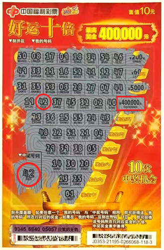 據(jù)了解,該中獎(jiǎng)?wù)叱壬ɑ┦枪喂螛?lè)的鐵桿粉絲,近日在銷(xiāo)售點(diǎn)休閑時(shí),隨手買(mǎi)了幾張刮刮樂(lè)彩票,沒(méi)想到在其中一張“好運(yùn)十倍”中,刮出的“我的號(hào)碼42”精準(zhǔn)擊中“中獎(jiǎng)號(hào)碼42”,中得對(duì)應(yīng)獎(jiǎng)金40萬(wàn)元。