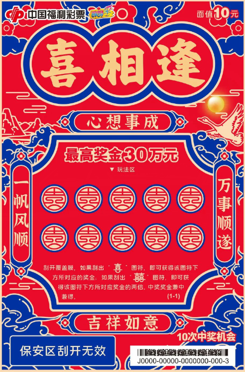 “喜相逢10元”共設(shè)11個(gè)獎(jiǎng)級(jí)、10次中獎(jiǎng)機(jī)會(huì),最高獎(jiǎng)金30萬(wàn)元。