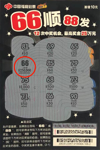 幸運市民刮中“66順88發(fā)”25萬元頭獎