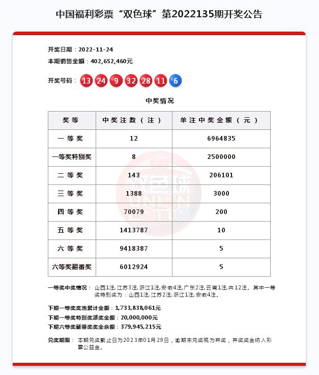 11月24日晚,雙色球進行第2022135期開獎,開出紅球號碼9、11、13、24、28、32,藍球號碼6。當期是雙色球12億元大派獎活動的第11期派獎,全國共中出一等獎12注,單注獎金為696萬余元;其中一等獎特別獎中出8注,單注獎金為250萬元。
