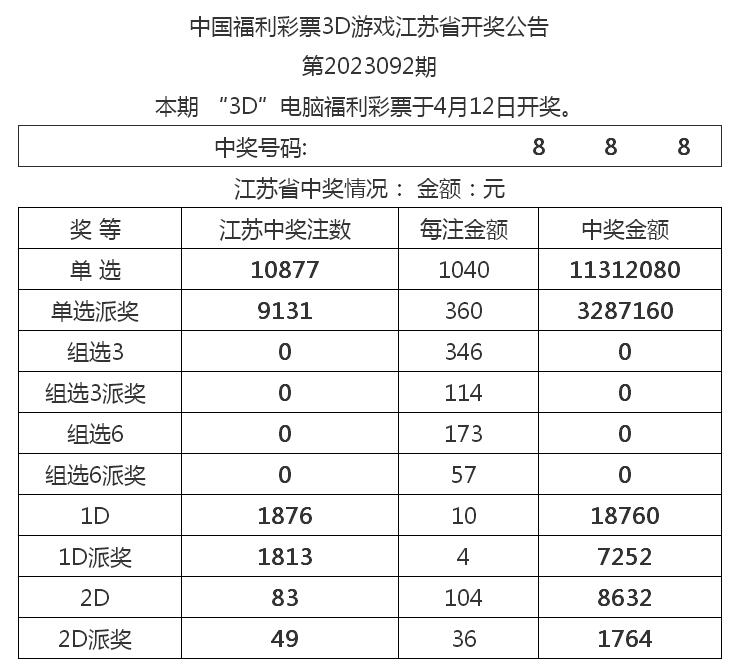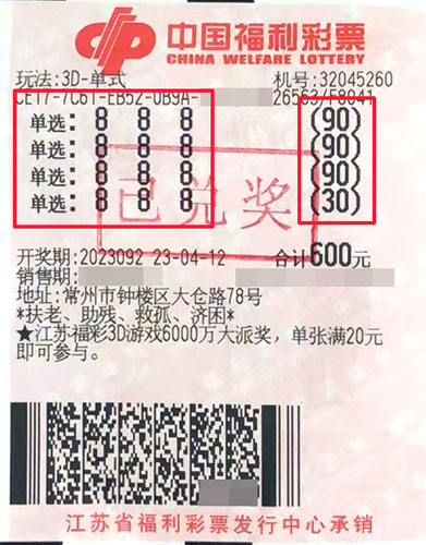 4月12日,3D游戲第2023092期開獎。當期市民張先生(化名)在鐘樓區(qū)大倉路32045260福彩投注站,對號碼“8、8、8”進行了300倍單選投注,精準擊中開獎號碼“8、8、8”,中得獎金31.2萬元。根據派獎規(guī)則,每注單選獎金增加360元,因此,張先生還額外獲得了10.8萬元的派獎獎金,本次共計攬獲獎金42萬元。