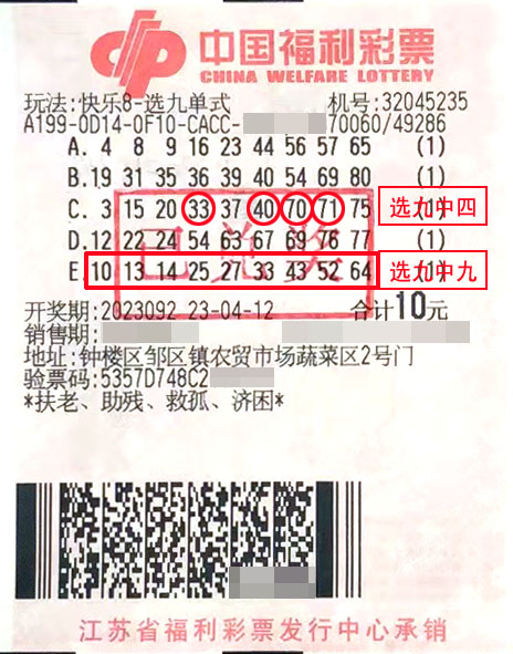 據(jù)了解,該獎(jiǎng)出自鐘樓區(qū)鄒區(qū)鎮(zhèn)農(nóng)貿(mào)市場32045235福彩投注站。中獎(jiǎng)市民小徐(化名)十分喜愛快樂8游戲,當(dāng)期他在店里花10元錢投注了5組選九單式號碼。開獎(jiǎng)后經(jīng)核對,其中的2組號碼幸運(yùn)中獎(jiǎng),1組擊中了“選九中九”,獎(jiǎng)金為30萬元,另一組中得“選九中四”,獎(jiǎng)金為3元。