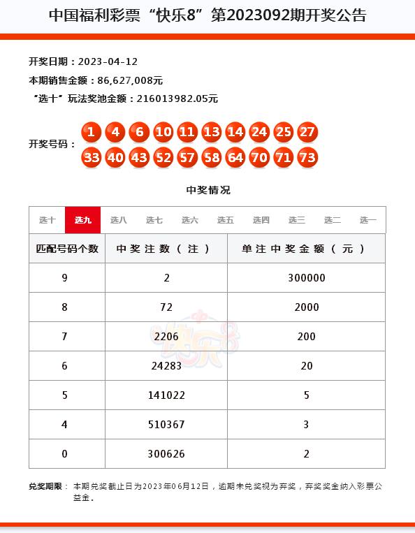 4月12日,一位市民朋友通過選九單式投注,在快樂8第2023092期擊中大獎(jiǎng)30萬元。