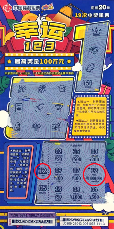 據(jù)了解,這位大獎得主楊先生(化名)是新彩友,偶爾購買刮刮樂休閑。近日,他在店里挑了幸運123”嘗嘗新鮮,結果在彩票玩法三中,刮出的我的號碼12”擊中中獎號碼12”,根據(jù)游戲規(guī)則中得對應獎金100萬元。