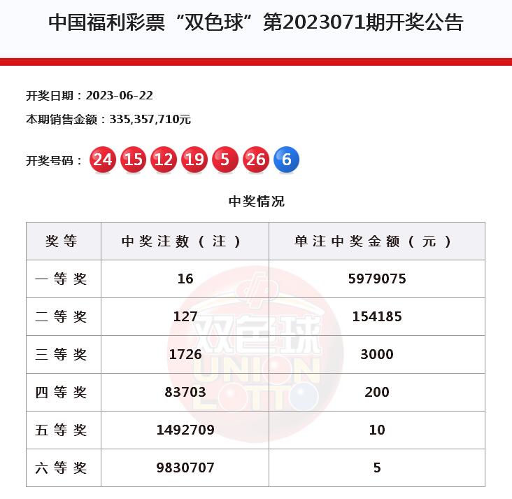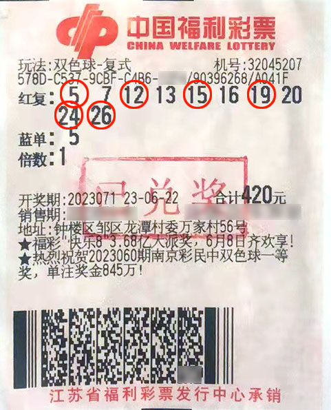 6月22日,雙色球第2023071期開出“紅球5、12、15、19、24、26,藍(lán)球6”。當(dāng)期一位幸運(yùn)市民通過復(fù)式投注喜中1注二等獎(jiǎng),合計(jì)攬獲獎(jiǎng)金15.9萬余元。