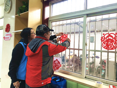在初步了解中國(guó)剪紙文化的基礎(chǔ)上,社工向康復(fù)員示范剪紙技法,詳細(xì)講解剪紙的基本步驟和注意事項(xiàng)。大家認(rèn)真聆聽(tīng),用心感悟,起初手法略顯生疏,但隨著不斷地摸索與實(shí)踐,逐漸熟悉了基本手法,一張張紅紙?jiān)谒麄兪种凶兂梢粋€(gè)個(gè)花式“福”字。大家?guī)е腋5男θ莅堰@些精心裁剪出來(lái)的“福”字作品貼在驛站的門(mén)窗上,為驛站增添了濃濃喜氣。