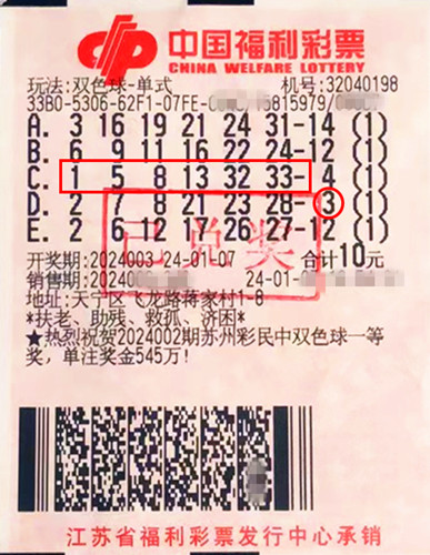 據(jù)了解,該獎出自天寧區(qū)飛龍路32040198福彩銷售點(diǎn)。中獎?wù)邊桥浚ɑ┊?dāng)期在店里花10元隨機(jī)投注了5組雙色球單式號碼。經(jīng)與當(dāng)期開獎號碼“紅球1、5、8、13、32、33,藍(lán)球3”核對,其中一組紅球全中,中得1注二等獎,另一組擊中藍(lán)球,中得1注六等獎,共計(jì)攬獲獎金22.6萬余元。