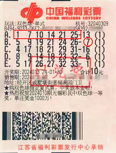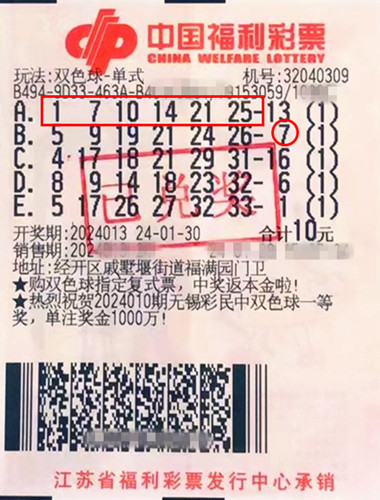 1月30日晚,雙色球第2024013期開(kāi)出紅球1、7、10、14、21、25,藍(lán)球7。當(dāng)期出自經(jīng)開(kāi)區(qū)戚墅堰街道32040309福彩投注站的2張雙色球彩票同時(shí)擊中二等獎(jiǎng)和六等獎(jiǎng)各1注,分別中得獎(jiǎng)金13.8萬(wàn)余元。中獎(jiǎng)?wù)弑硎荆盏礁2蔬@份特別的新春好禮非常驚喜,會(huì)繼續(xù)以平常心奉獻(xiàn)愛(ài)心、助力公益。