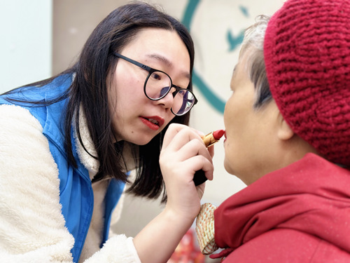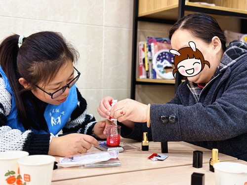 在隨后的口紅DIY環(huán)節(jié),康復員們化身嚴謹?shù)膶嶒炄藛T,用量杯和電子秤精準測出各種所需材料的用量,用電熔爐融化再制模脫膜,認真完成一道道制作工序。一位康復員感慨地表示,這些步驟讓她想起了過去學化學以及做檢驗員的日子,她以自己為豪。