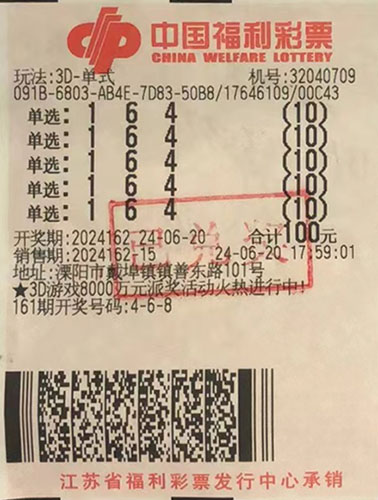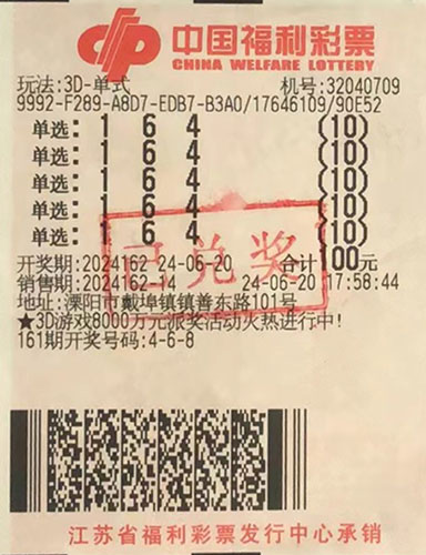 據(jù)了解,中獎市民徐先生(化名)是福彩的老朋友,對雙色球、3D等電腦票玩法喜愛有加。當(dāng)期他在溧陽市戴埠鎮(zhèn)32040709福彩投注站購彩休閑,對自選號碼“164”進(jìn)行了100倍單選投注,幸運(yùn)擊中開獎號碼“164”。適逢3D開展8000萬元派獎,根據(jù)派獎規(guī)則,單注單選獎金由原先的1040元提高至1300元,因此,徐先生本次共計(jì)攬獲獎金13萬元,其中包含派獎獎金2.6萬元。