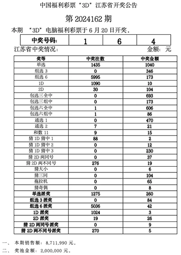 620日,3D游戲第2024162期開出號碼“164”。當(dāng)期我市一位市民朋友幸運(yùn)攬獲獎金13萬元。