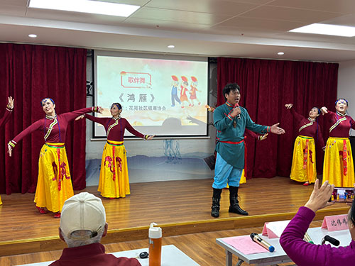 啟動儀式后,花苑社區(qū)老年群體成為活動主角,13個精心準(zhǔn)備的節(jié)目輪番上演,涵蓋詩朗誦、歌伴舞、戲曲、樂器演奏等多種形式。詩朗誦《九三閱兵有感》,字里行間滿是家國情懷;歌伴舞《鴻雁》展現(xiàn)靈動風(fēng)采;《重陽抒懷》《別慌,才六十歲而已》等詩朗誦,更是道出老年群體積極樂觀的生活態(tài)度。