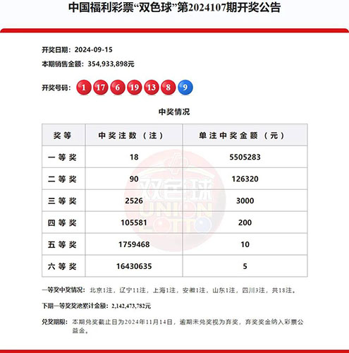 9月15日晚,福彩雙色球第2024107期開獎,開獎號碼為:紅球1、6、8、13、17、19,藍球9。我市一位幸運購彩者攬獲當期獎金12.8萬余元。