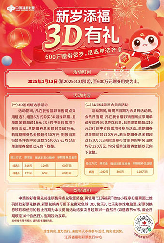 新歲添福,3D有禮。江蘇福彩3D游戲600萬元系列營銷活動(dòng)即將開啟,來收獲2025年的第一波福運(yùn)!