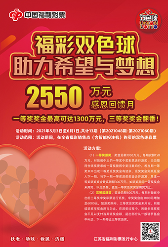 為展示江蘇福彩公益品牌形象,回饋廣大彩民對雙色球游戲的支持與喜愛。省福彩中心決定自5月起,開展雙色球感恩回饋月活動(dòng)。