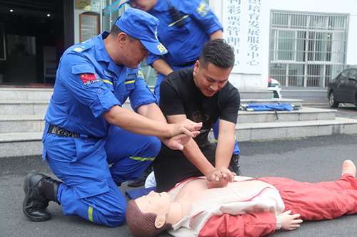 隨后,所有參訓(xùn)者進行了煙道疏散逃生演練,模擬在濃煙環(huán)境下進行疏散自救逃生。按照制定的消防應(yīng)急疏散演練實施方案,參訓(xùn)職工按照疏散逃生要求,緊張、有序地沿著樓梯撤離到樓下指定區(qū)域,并在救援隊隊員的指導(dǎo)演示下進行了“心肺復(fù)蘇急救”現(xiàn)場實操。演練過程中,全體人員反應(yīng)迅速、快速疏導(dǎo)、安全有序進行人員疏散,準確掌握心肺復(fù)蘇救護要領(lǐng),達到了預(yù)期目的。