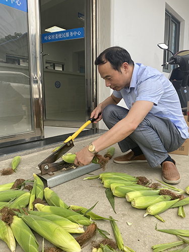 福彩中心黨員代表首先幫助村委工作人員,對業(yè)已被預定的天然無公害玉米進行挑選、切割、稱重、包裝,體驗了一把農(nóng)作的艱辛與樂趣。
